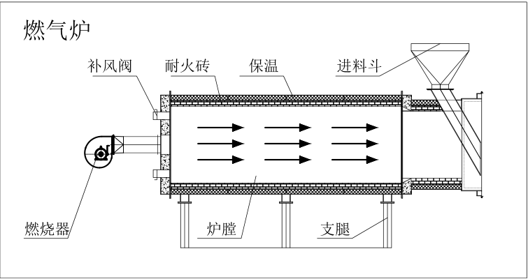 燃料通過燃燒器燃燒,產(chǎn)生高溫?zé)煔?,高溫?zé)煔馀c冷空氣充分熱交換,達到設(shè)定溫度后進入烘干機內(nèi)部,當(dāng)熱風(fēng)溫度達到額定的上限溫度時,燃燒器會自動停止燃燒或轉(zhuǎn)為小火焰燃燒,當(dāng)熱風(fēng)溫度降低到額定的下限溫度時,燃燒器又會重新點燃運行或轉(zhuǎn)為大火焰燃燒,升溫的速度可調(diào)進風(fēng)閥來實現(xiàn)。